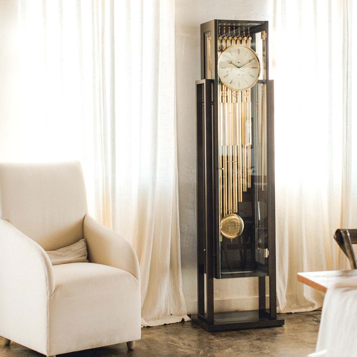 Ultra-modern glass sided walnut case showcases the stunning triple chime, tubular movement. The sleek design of this floor clock will make it the focal point of any room.