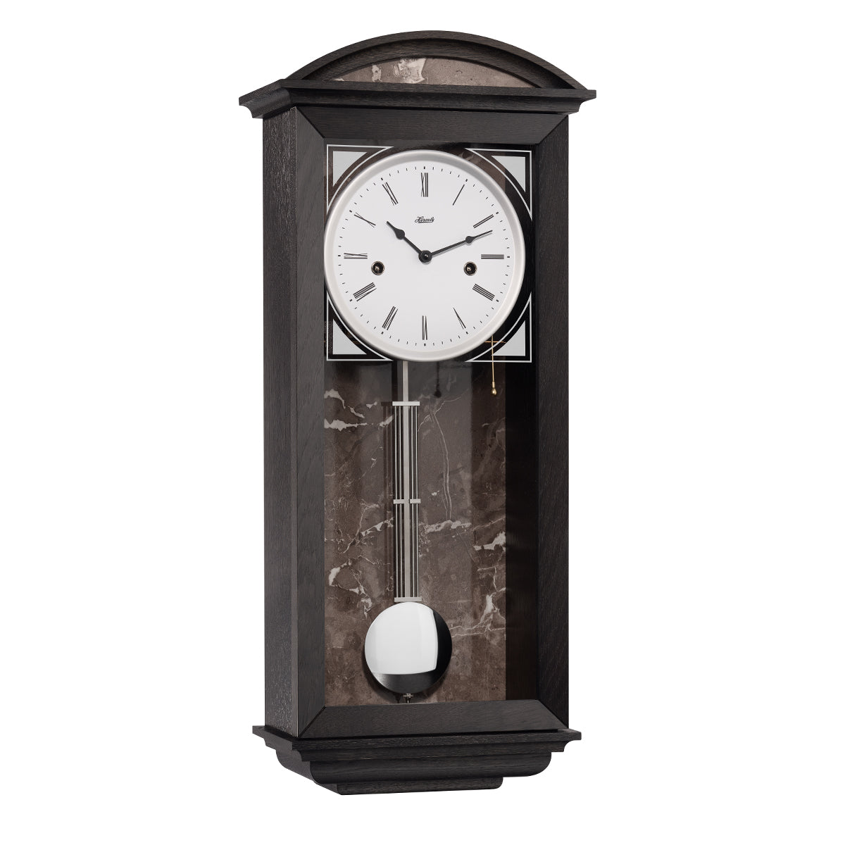 Elegant regulator in various designs. Equipped with a 14-day half-hour strike movement or an 8-day movement with 4/4 Westminster strike.